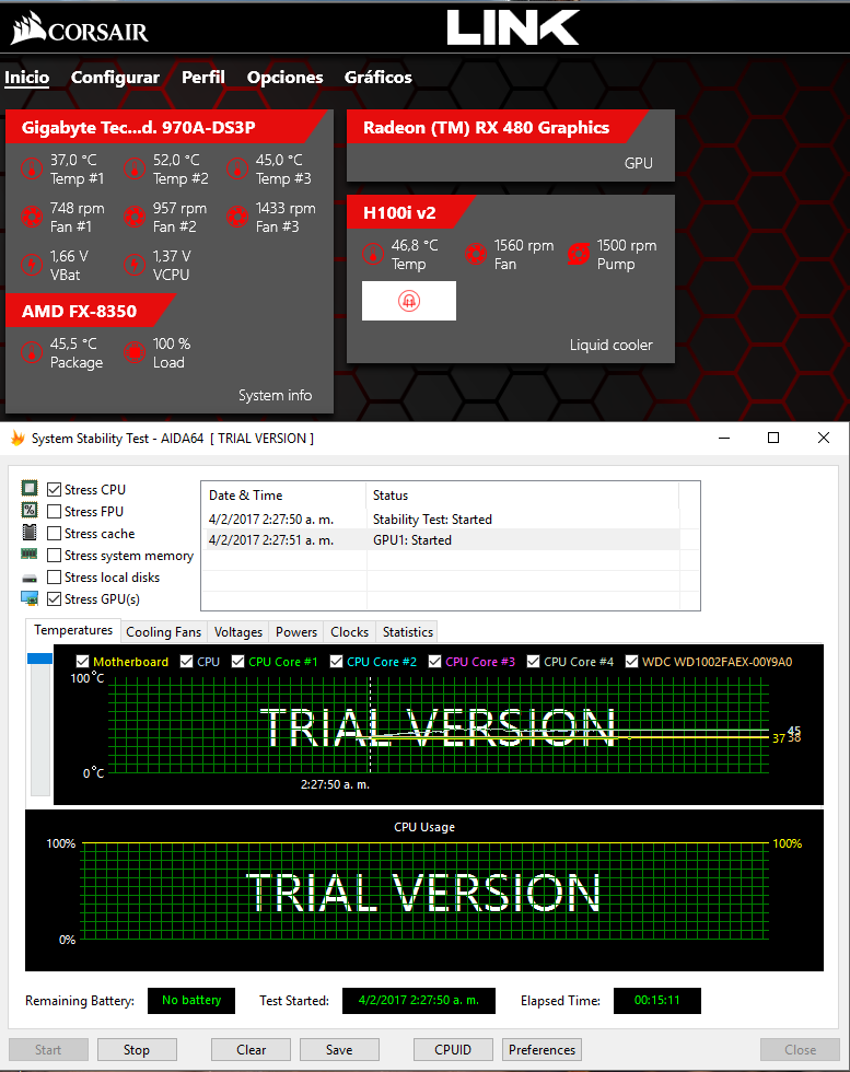 Analizando los datos vemos que las temperaturas en reposo para ser el micro con el que estamos teniendo problemas no están mal del todo, y más teniendo en cuenta lo que sube una vez comenzamos a estresarlo de verdad con el test de Aida64. Vemos que durante 15 minutos hemos dado todo lo que puede el micro, llegando a una temperatura estable de 58 dejando claro que los ventiladores Corsair hacen un buen trabajo. Sin embargo estamos aquí para ver cuál es el trabajo real de la refrigeración líquida AIO H100i V2. Veamos qué ocurre con las mismas pruebas (os recordamos que hemos optado por la opción de sacar el aire caliente hacia afuera, por lo que los resultados son susceptibles de mejorar un poco más).