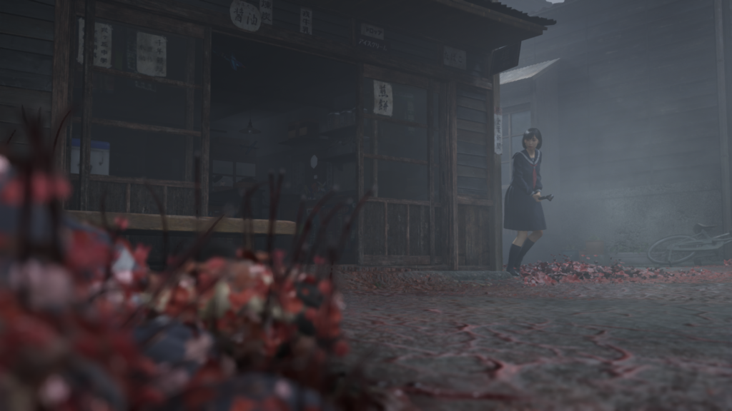 La exploración en SILENT HILL f es híbrida: mezcla diseño semi-lineal con zonas abiertas que invitan a la deriva. Los niveles contienen capas, calles diurnas y su contraparte difusa bajo la niebla, interiores aparentemente cotidianos que esconden fisuras, y el jugador es incentivado a leer el espacio. Los mapas no son meramente pasillos; son rompecabezas espaciales que nos obligan a recordar puntos de referencia, a usar la cámara como herramienta interpretativa y a detectar discrepancias en la arquitectura.