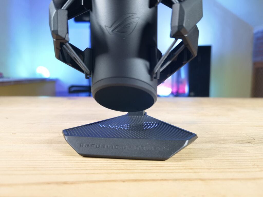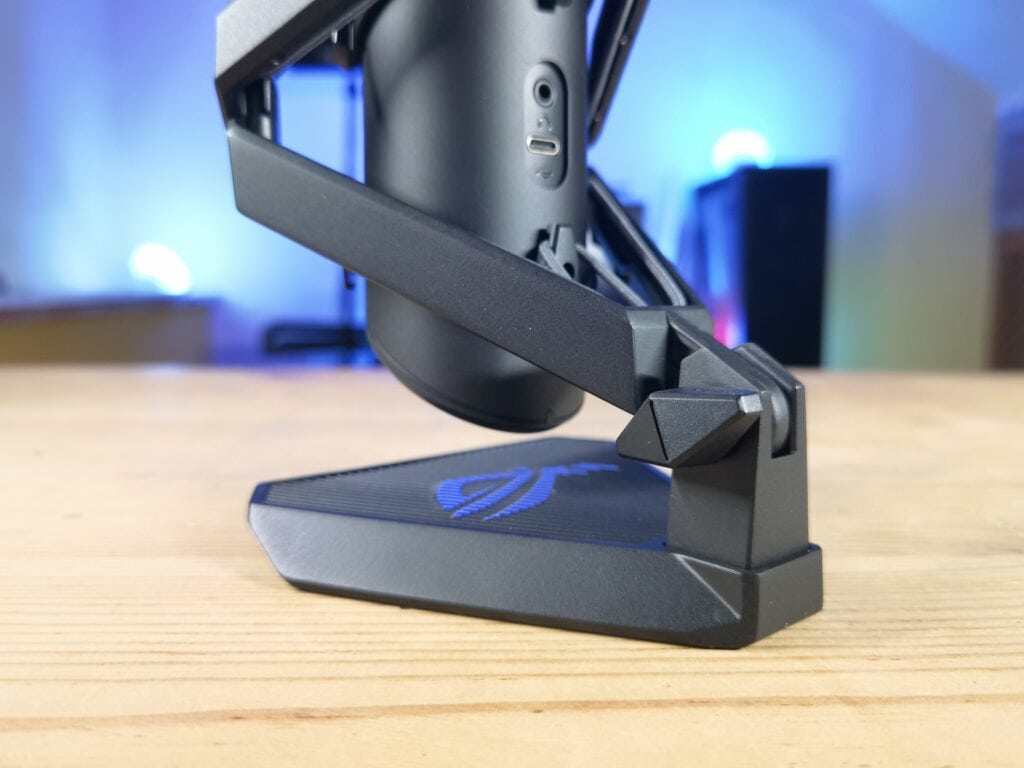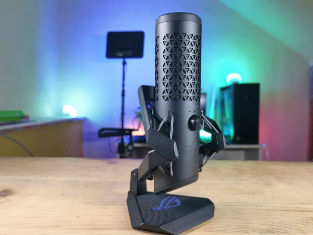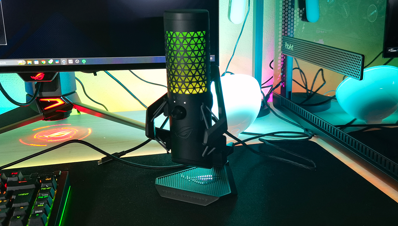 Justo encima de dicho controlador encontramos el filtro anti-pop del micrófono, dotado de una preciosa retroiluminación RGB que dota de ese toque gaming al micrófono y que podremos personalizar desde la plataforma de software Armoury Crate junto a otras funciones del mismo. Y como guinda del pastel encontramos, en la cubierta superior del micrófono, un práctico panel táctil que nos permitirá mutear el micrófono de forma totalmente silenciosa para que no se cuele ese «click» del mute en nuestros streamings o grabaciones.