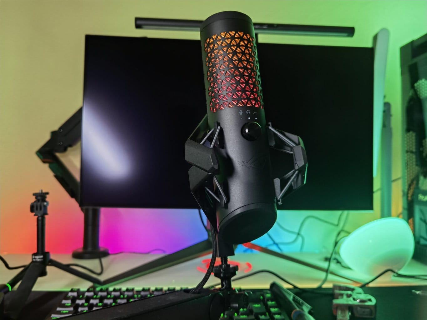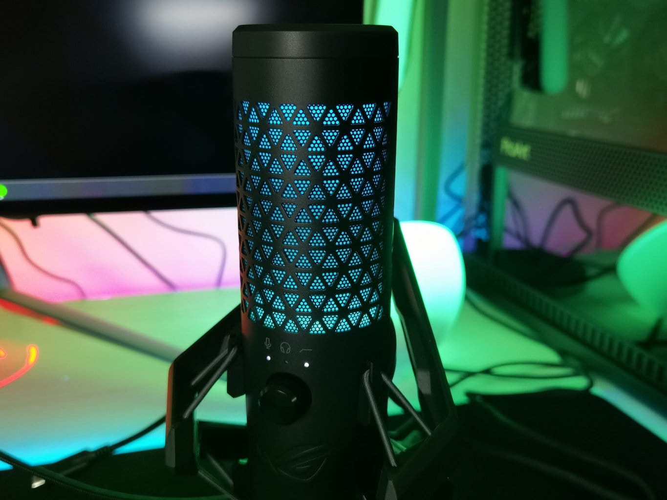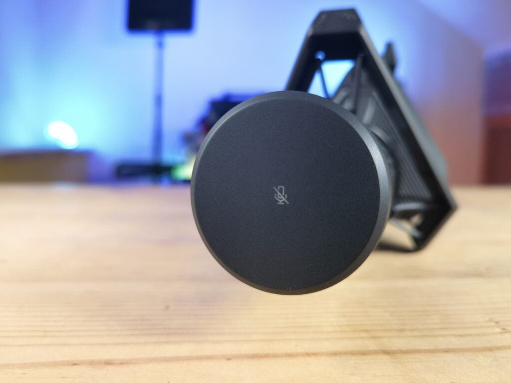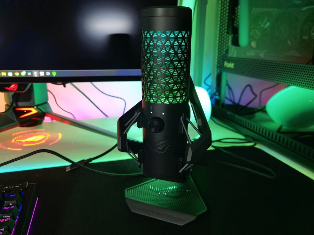Justo encima de dicho controlador encontramos el filtro anti-pop del micrófono, dotado de una preciosa retroiluminación RGB que dota de ese toque gaming al micrófono y que podremos personalizar desde la plataforma de software Armoury Crate junto a otras funciones del mismo. Y como guinda del pastel encontramos, en la cubierta superior del micrófono, un práctico panel táctil que nos permitirá mutear el micrófono de forma totalmente silenciosa para que no se cuele ese «click» del mute en nuestros streamings o grabaciones.
