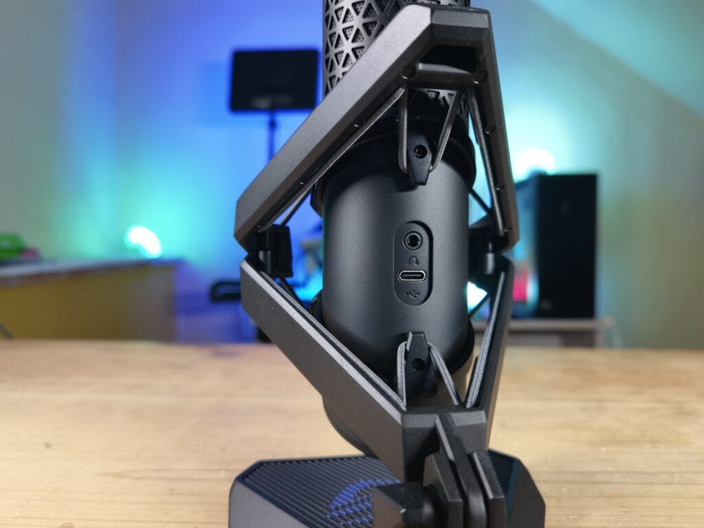 Si pasamos a ver físicamente el micrófono lo primero que nos sorprende es su estética futurista, conseguida en parte gracias al soporte anti-vibraciones del mismo. Este soporte no solo cuenta con una función práctica y estética, la de sostener el cuerpo del micrófono en vertical y darle un toque gaming precioso al conjunto, sino que además cuenta con un sistema de anti-vibraciones, con elásticos de suspensión incluidos, que evitará que las vibraciones de tu escritorio se transmitan al micrófono en forma de molestos ruidos o golpes.