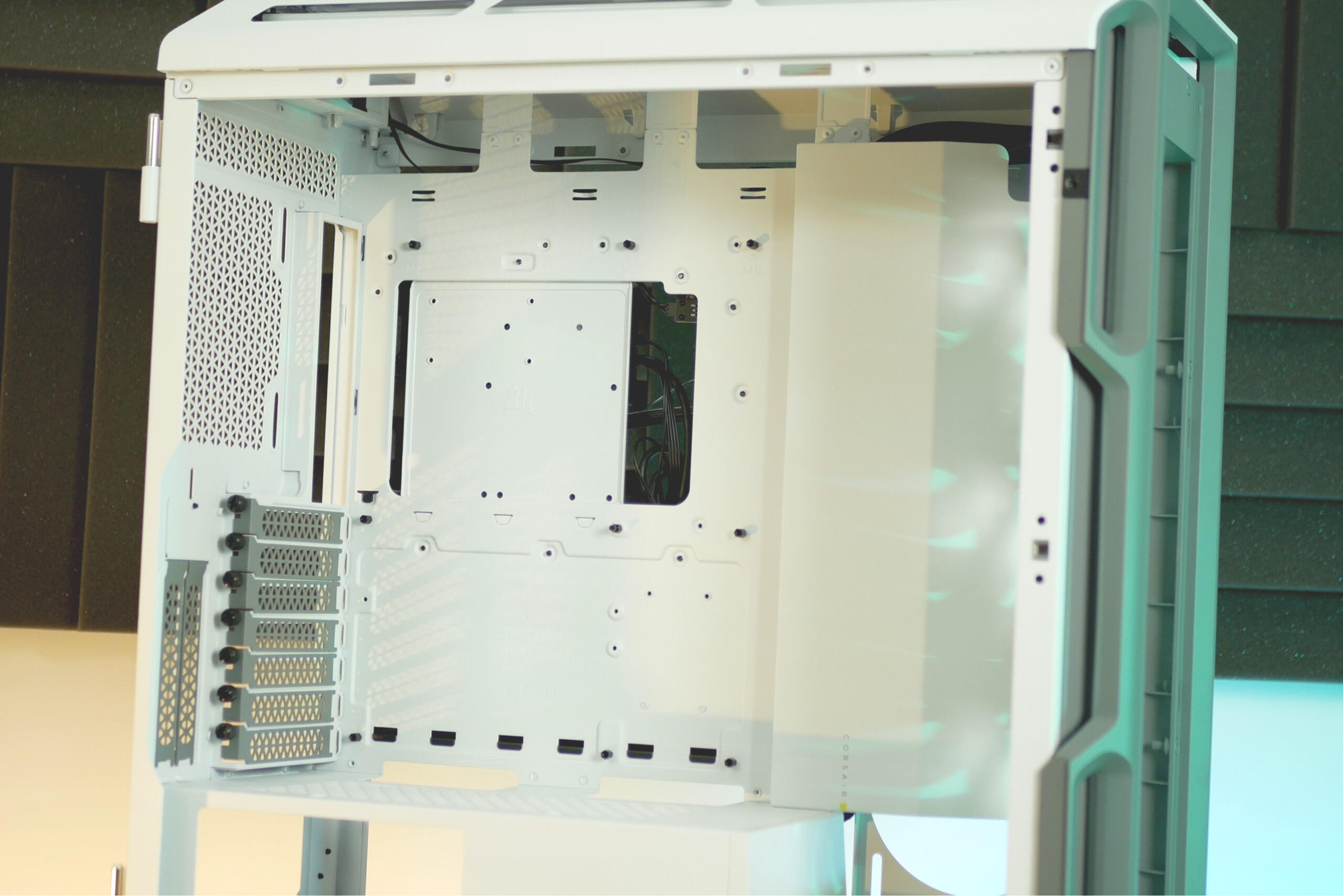 Si pasamos al lateral derecho encontramos un panel metálico con el mismo sistema de cierre lateral con bisagras que vimos en el panel de vidrio templado, tras el cual encontramos un elaboradísimo sistema de gestión de cableado bautizado como CORSAIR RapidRoute Cable Management System. Este sistema, y los 30 mm de espacio que hay entre la placa y la puerta, nos permit realizar una instalación muy limpia en muy poquito tiempo. Además, también encontramos las bahías de 2’5” y el iCUE COMMANDER CORE XT, un controlador inteligente para ventiladores (hasta 6) y canales de iluminación duales para múltiples componentes RGB.