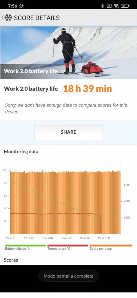 En el apartado de especificaciones del terminal veíamos como la batería apuntaba maneras a ser una de las principales bazas del terminal, y no erramos el tiro. Como de costumbre hacemos uso del terminal como nuestro dispositivo de cabecera usándolo con un ritmo bastante frenético: gestión de varias cuentas de correo con mucho movimiento, las redes sociales de la web, comentarios, mensajería instantánea, muchas llamadas de teléfono, casi siempre fuera de casa sin WiFi, música en streaming para entrenar… Y aún así hemos conseguido superar la barrera de las 7 horas de pantalla. Si optamos por una medición más objetiva de la batería, en el sentido de que sea orientativo para comparar con otros terminales y no porque sea una cifra real de autonomía, utilizamos el test de batería de PcMark obteniendo la friolera de 18h y 39 minutos. En lo referente a la carga, alcanzamos el 73% en 30 minutos y el 100% en 58 minutos, con el terminal apagado.