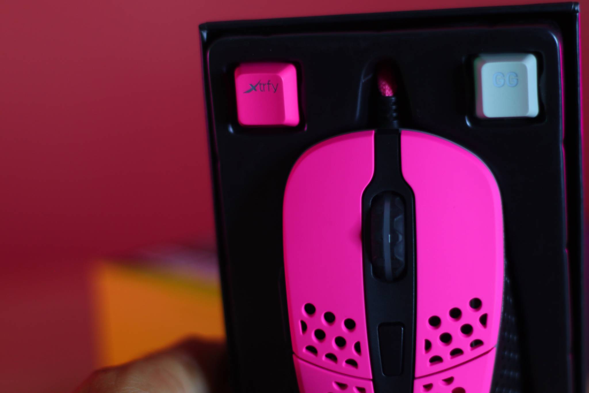 Comenzamos con el ratón, el Xtrfy M4 nos llega en una cajita de cartón que nos muestra el diseño del ratón en su portada, dejando la trasera para las especificaciones técnicas del mismo. Una vez abierta la caja encontramos el ratón perfectamente presentado en una bandeja, junto con dos teclas con la serigrafía Xtrfy y GG para personalizar nuestro teclado a juego con el ratón. Bajo la bandeja en la que se nos presenta el ratón, encontramos la documentación, una pegatina y el cable perfectamente recogido.